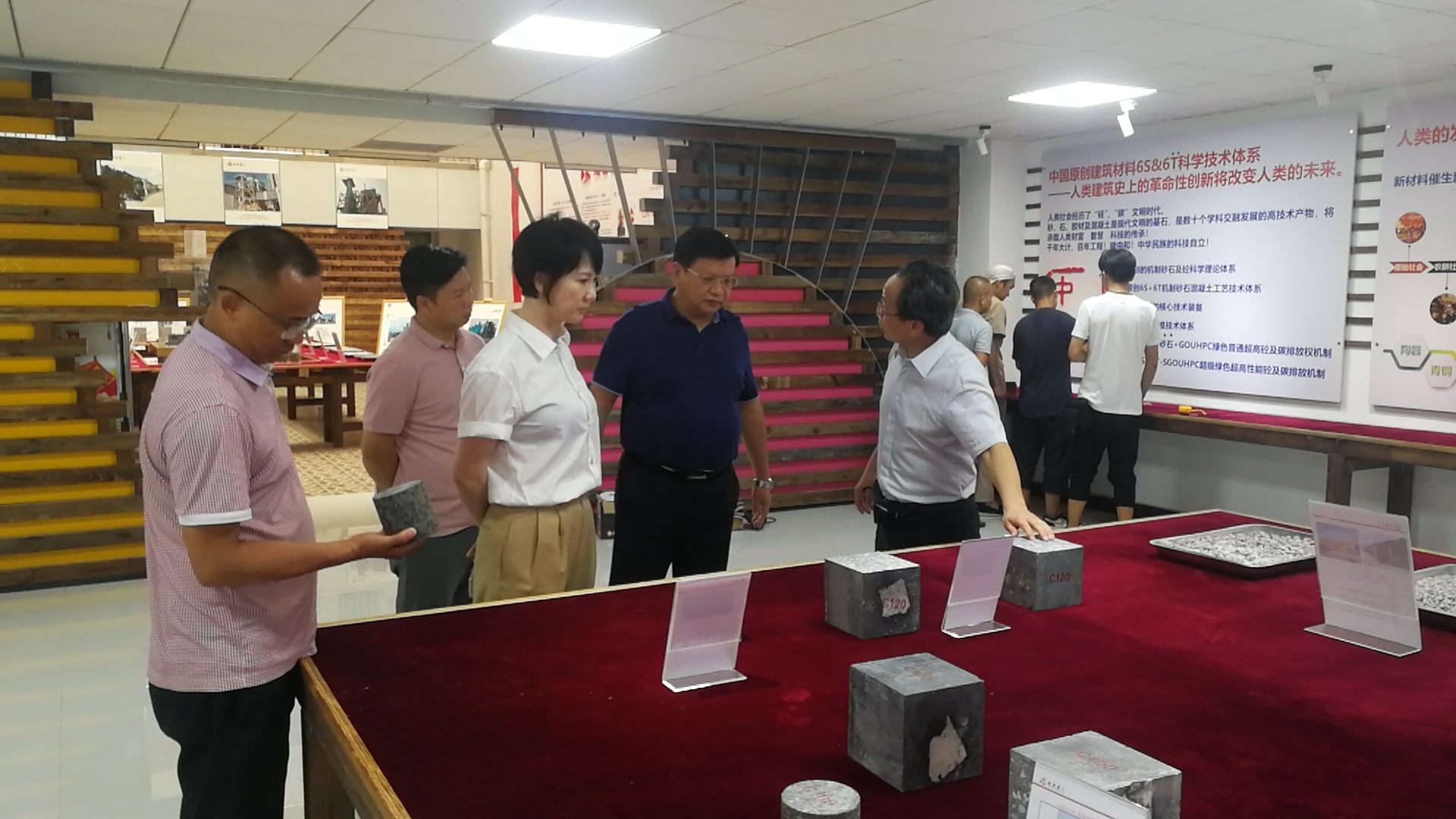 ? ? ? 成智科技執(zhí)行董事朱東敏先生(圖右一)在一樓展廳向來訪嘉賓介紹了建筑材料在國家戰(zhàn)略發(fā)展中的支撐地位、當(dāng)今全球混凝土材料存在的幾大問 題,成智科技中國原創(chuàng)材料 6S&6T 科學(xué)技術(shù)體系及該體系在項(xiàng)目中的實(shí)際應(yīng) 用等相關(guān)內(nèi)容。朱東敏先生還特別強(qiáng)調(diào)要建立現(xiàn)有工程材料四大分類之外的 第五種分類方式,呼吁建立工法機(jī)制砂石集料的科學(xué)技術(shù)體系、工業(yè)體系和 質(zhì)量標(biāo)準(zhǔn)體系。